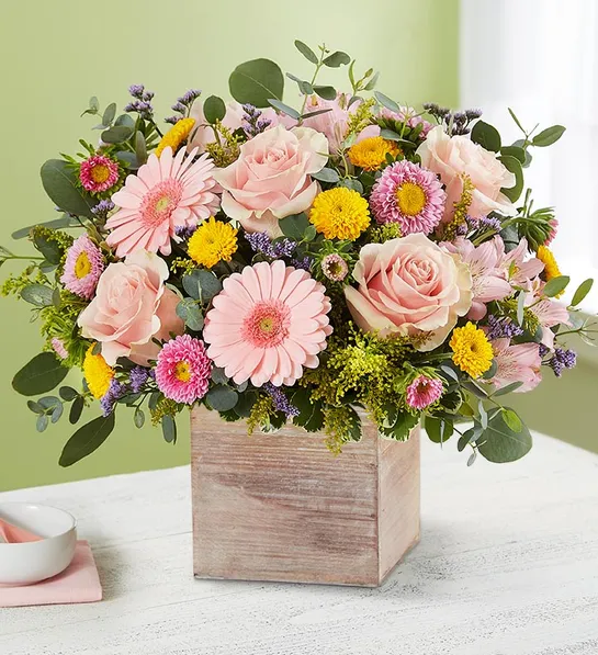 + Free ShippingSpring is a time to refresh and reach out. Our spring bouquet celebrates that sentiment. Soft pink and yellow blooms are loosely gathered with lush greenery for style and texture. Designed in our rustic, grey-washed wooden cube, it’s a gift that delivers on your feelings in the most beautiful way. The large arrangement measures approximately 11″H x 11″W. Our florists hand-design each arrangement, so colors and varieties may vary due to local availability